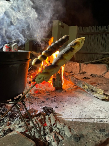 A wonderful novelty where dough is twisted around a stick and cooked over the open fire.